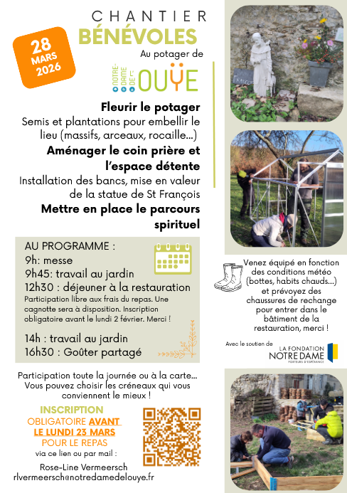 Nous vous donnons rendez-vous le samedi 28 mars pour la prochaine journée bénévole ! Au programme, nous sèmerons et planterons de nombreuses fleurs pour embellir le potager, nous continuerons les aménagements avec l'espace détente et le coin prière et nous installerons la signalétique du parcours spirituel proposé au potager !