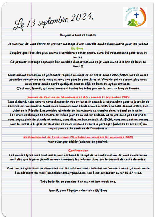 N.B: Petite précision concernant le repas partagé du samedi 21 septembre au soir (après la messe) qui est que ceux qui le souhaitent puissent apporter un plat, une boisson à partager, merci par avance!