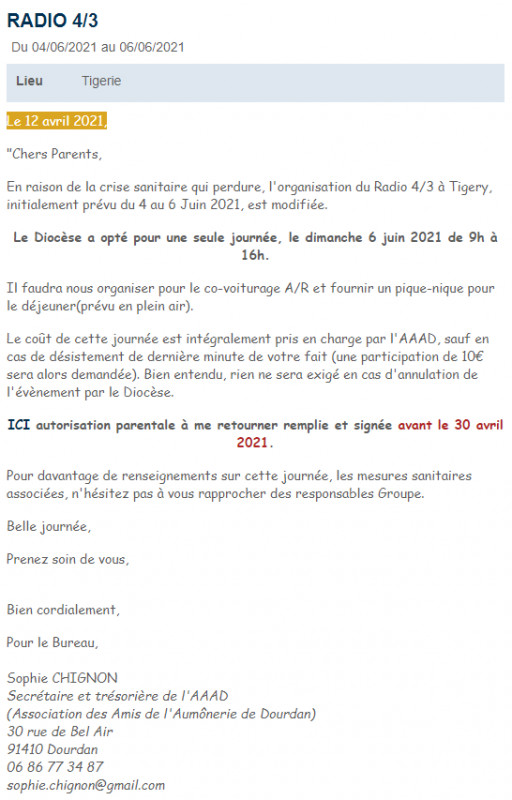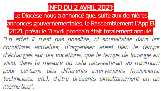 Cette journée se vivra en famille. Il n'y aura donc pas de réunion à Dourdan (pas de messe des jeunes non plus).