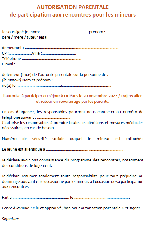 Cliquez sur l'image ci-après pour télécharger, imprimer et remplir l'autorisation parentale nécessaire, qui sera à confier au jeune pour le jour du voyage ! Merci !